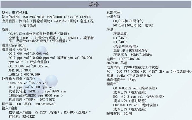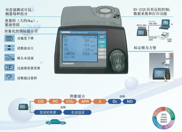 MEXA-584LÊÇHORIBA×îÐÂÍÆ³öµÄΪÆû³µÎ¬»¤ÐÞÀí£¬°²È«¼ì²éºÍÒ»°ã·¢¶¯»úµ÷ÊÔרÃÅÉè¼ÆµÄ±ãЯʽ·ÖÎöÒÇ£¬ÄÜͬʱ²âÊÔµ¡ËÙ״̬Ï·¢¶¯»úÅÅÆøÖеÄCO¡¢HC¡¢CO2¡¢O2¡¢NO£¨Ñ¡Ï5ÖֳɷݵÄŨ¶È£¬»¹ÄܲâÊÔ¿Õȼ±È£¨A/F£©¡¢¹ýÁ¿¿ÕÆøÏµÊý£¨λ£©¡¢·¢¶¯»úתËÙ(RPM)¼°»úÓÍζÈ(TEMP)¡£ÁíÍ⣬ËüÓÐÒ»¸öÇåÎúµÄLCDÏÔʾÆ÷£¬²Ù×÷¼òµ¥£¬Í¬Ê±Ò²¿ÉÒÔÓÃÔÚÆû³µÎ¬ÐÞÖ®ÍâµÄÆäËûÁìÓò¡£
