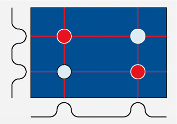 我们现在看到最多的是 Multi-Touch Gesture ,即两个手指触摸时,可以识别到这两个手指的运动方向,但还不能判断出具体位置,可以进行缩放、平移、旋转等操作。这种多点触摸的实现方式比较简单,轴坐标方式即可实现。把 ITO 分为 X 、 Y 轴,可以感应到两个触摸操作,但是感应到触摸和探测到触摸的具体位置是两个概念。 XY 轴方式的 触摸屏 可以探测到第 2 个触摸,但是无法了解第二个触摸的确切位置。单一触摸在每个轴上产生一个单一的最大值,从而断定触摸的位置,如果有第二个手指 触摸屏 面,在每个轴上就会有两个最大值。这两个最大值可以由两组不同的触摸来产生,于是系统就无法准确判断了。有的系统引入时序来进行判断,假设两个手指不是同时放上去的,但是,总有同时触碰的情况,这时,系统就无法猜测了。我们可以把并不是真正触摸的点叫做 “ 鬼点 ” ,如图 1 所示。