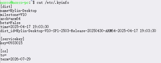 测试机操作系统为银河麒麟桌面版V10-SP1系统,具体系统版本见下图。
