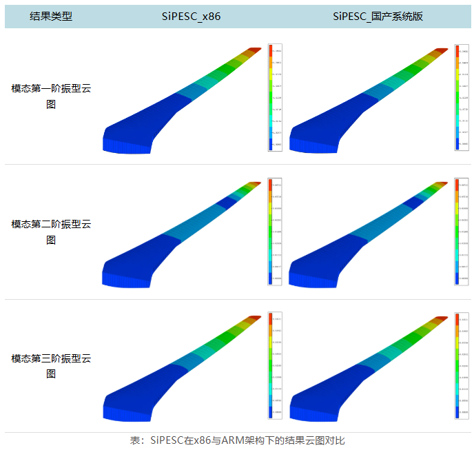 分别在可视化界面导入SiPESC_x86与SiPESC_国产系统版的模态分析振型云图,如下表所示。