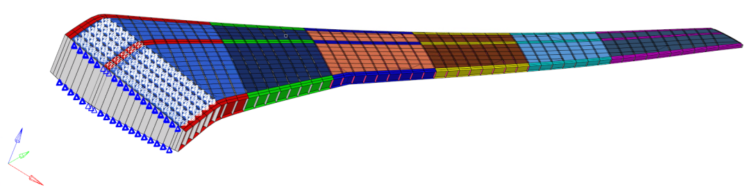 测试模型2为一个复合材料结构机翼模型,采用铁木辛柯梁、DKT壳(DKT板+常应变三角形膜)、DKQ壳(DKQ板+非协调四边形膜)、复合材料层合板(薄)等单元进行模拟。模型一侧约束,采用子空间法进行了模态分析。