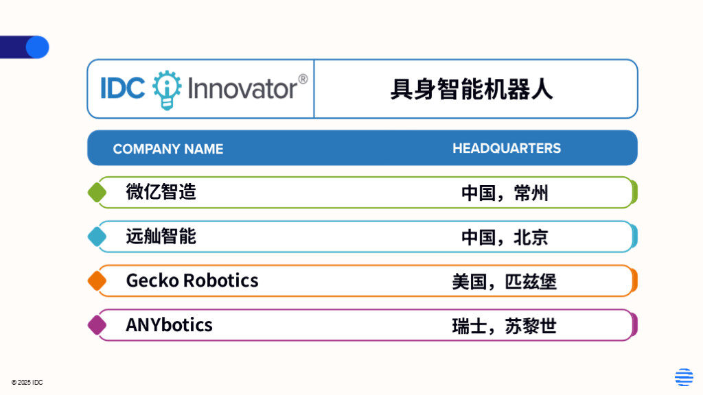 本次,IDC选择了四家具有代表性的企业作为全球创新者代表,他们在各类应用场景推动了具身智能机器人的落地与商业化发展: