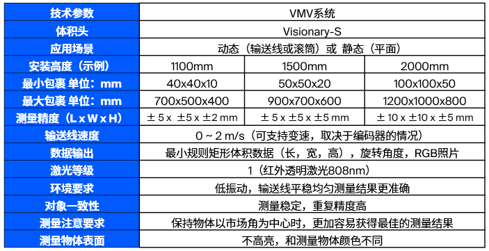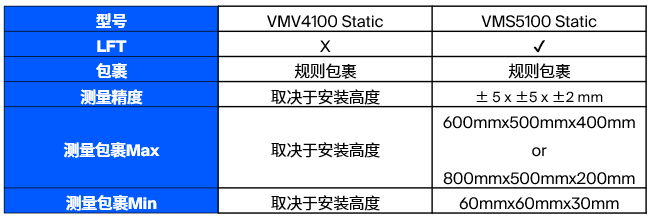 静态体积测量,分为VMV4100 Static和VMV5100 Static,两者的主要区别是VMV5100 Static可以为客户提供LFT(Legal for Trade)用于包裹计费使用。