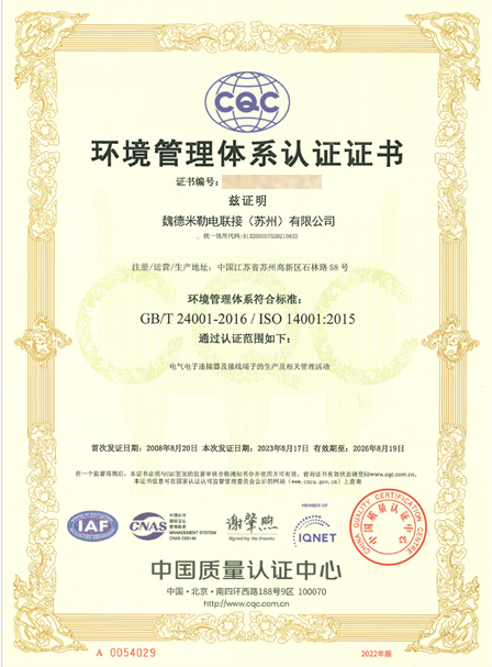 其旗下魏德米勒电联接 (苏州) 有限公司所持有的 GB/T 24001-2016/ISO 14001:2015 环境管理体系认证,便是这一体系落地的有力佐证。自 2008 年首次获证以来苏州工厂便持续更新,并将体系要求转化为具体行动: