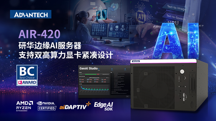 研华AIR-420边缘AI服务器配备NVIDIA高阶显卡,尺寸轻巧却具备强大计算效能,专为生成式AI、LLM推理与多模态应用而打造,能在边缘端实时处理复杂模型,实现低延迟、高稳定的AI计算体验。AIR-420边缘AI服务器已广泛应用于智能制造、医疗影像分析及LLM大语言模型生成等场域,协助用户将AI从云端延伸至现场边缘端,并于今年获得BC Award (Best Choice Award)及台湾精品奖的双重肯定。