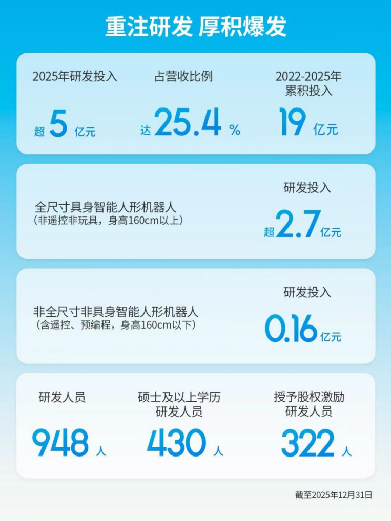 2025年优必选研发投入超5亿元,占营收比例达25.6%,其中,全尺寸具身智能人形机器人(非遥控非玩具,身高超过160cm)研发投入超2.7亿元,非全尺寸非具身智能人形机器人(含遥控、预编程及玩具,身高160cm以下)研发投入0.16亿元。