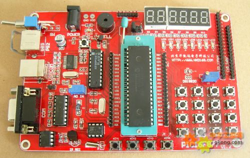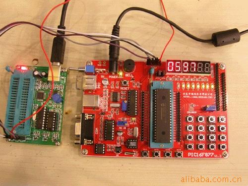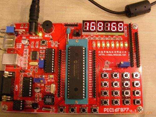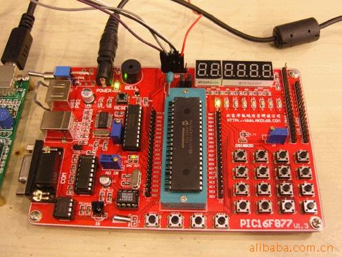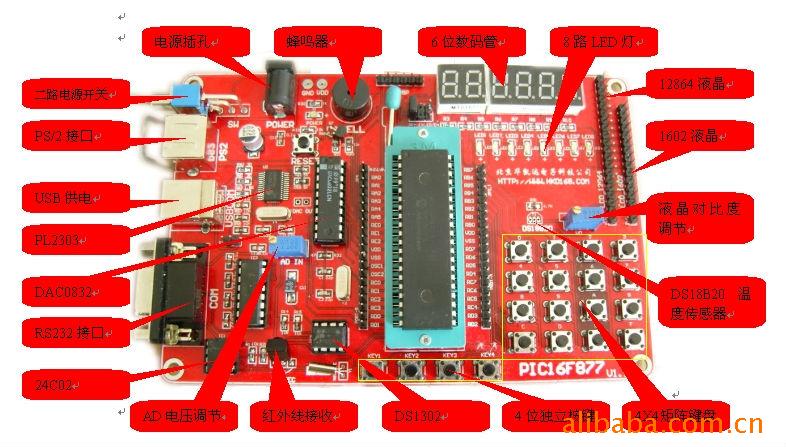 PIC16F877开发板简介 PIC开发板硬件分布图好消息:现购PIC16F877开发板就送价格75元的K150 USB编程器,数量有限,先买先得,快行动吧!