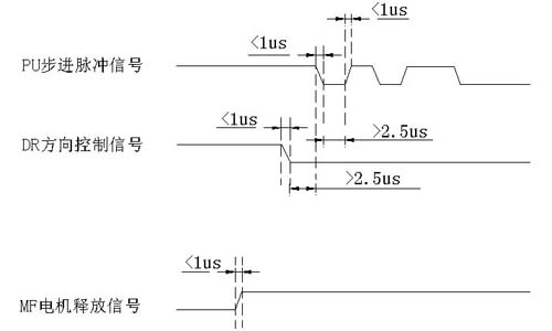 下降沿有效,每当脉冲由高变低时电机走一步,输入电阻220Ω,要求:低电平0-0.5V,高电平4-5V,脉冲宽度>2.5μS