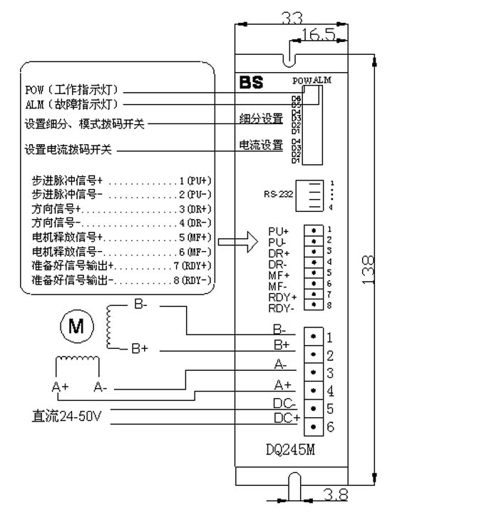 DQ245M是基于DSP控制的两相步进电机驱动器。它是将先进的DSP控制芯片和独特的控制电路结合一起所构成的新一代全数字步进电机驱动器。驱动电压为DC24-50V,适配电流在4.0A以下、外径42-57mm的各种型号的两相混合式步进电机。该驱动器内部采用类似伺服控制原理的电路,此电路可以使电机运行平稳,几乎没有震动和噪音。定位精度最高可达40000脉冲/转。该产品广泛应用于雕刻机、小型数控机床、包装机械等分辨率较高的中、小型数控设备上。