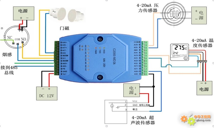本司的C2000 MDIA 4-20mA输入模块产品为系统集成商、工程商集成了标准的Modbus RTU协议。通过RS-485即可实现对远程模拟量设备的数据输入输出进行采集和控制。4-20mA输入模块下层设备通常有接近开关、机械 开关、按钮、光传感器、LED以及光电开关等数字量开关设备及PH、电导计、温度计、湿度计、压力计、流量计、启动器和阀门等模拟量设备。