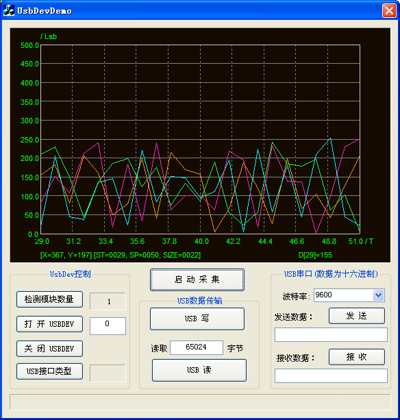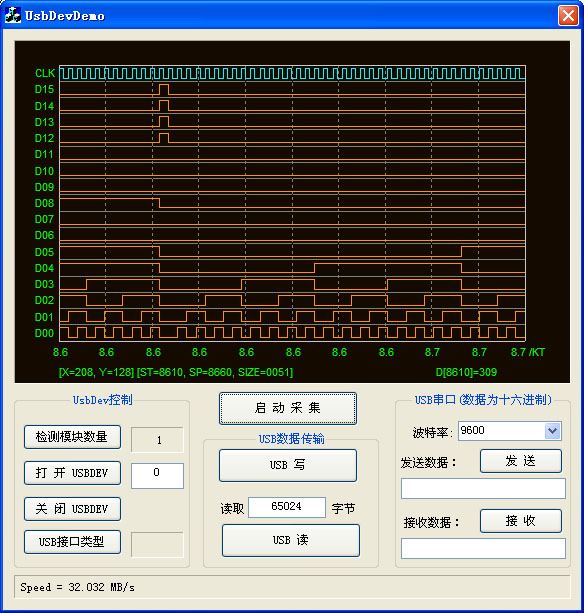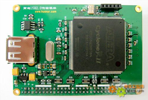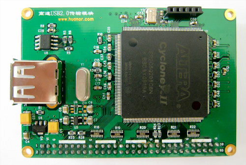产品简介: USBMOD6模块是北京华诺铭科电子科技中心设计的一款高速USB2.0数据传输模块,有效数据实时稳定传输速度达32M字节/秒。更高传输速度可以定制,最高可达44M字节/秒。该USB2.0模块完全屏蔽了复杂的USB2.0协议,将电脑的USB2.0接口转换为一个透明的并行总线数据传输接口和一个普通的串口。可以方便的跟FPGA、CPLD、DSP、ARM、单片机等外部控制器连接。在电脑主机上,提供专用动态库,方便被各种编程语言调用。FPGA程序和VC应用程序开源设计,利用该USB模块,您可以在最短的时间内完成高速的USB2.0数据传输功能的开发。功能特点:1、FPGA程序和VC应用程序开源设计,用户可以根据自己的需要修改源码;2、提供多种应用实例源码,如普通收发实例、AD采集实例、逻辑分析仪实例、图像采集实例等;3、独家提供稳定高效的SRAM虚拟FIFO技术,可将普通SRAM虚拟成高速大容量的FIFO来使用,免去使用两片SRAM做乒乓缓存,即可以降低成本,又可以使设计变得更简单;4、实时传输速度高,有效数据可达32M字节/秒,更高速度可以定制,最高可达44M字节/秒;5、数据双向传输,可以同时上传和下传;6、硬件接口简单,可以方便的跟FPGA、CPLD、DSP、ARM、单片机等控制器连接;7、大缓存硬件设计,容量高达512K字节;8、外扩独立的全双工异步串口,串口波特率可设,最大波特率为115200bps;9、提供专用动态库,可以方便的被各种高级编程语言调用,并提供相应的动态库调用实例;10、提供FPGA、单片机等控制器的接口通讯源代码;11、模块电路板采用多层板设计,采用全板沉金的表面处理工艺,信号线等长设计,并用专业的电路板信号仿真软件对信号进行仿真,充分保证了信号传输的稳定可靠;12、模块尺寸:72×50×15mm。模块应用:1、USB数据采集系统;2、USB逻辑分析仪;3、USB高速图像采集系统;4、USB数字存储示波器;5、USB工业控制系统;产品清单:1、USBMOD6模块一块;2、USB双层屏蔽线一条;3、光盘1张(内含动态库、相关源码、使用说明、原理图和PCB库、工具软件等); 产品图片展示: 模块正面 模块背面 完全沉金工艺 信号线等长设计 4路AD采集示例 16路逻辑分析仪示例