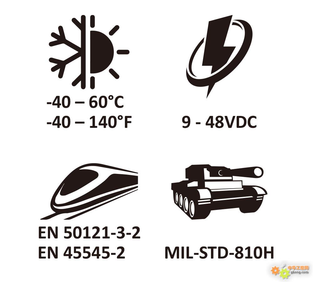 具备宽温(-40°C - 60°C)、宽电压(9 - 48 VDC)、过电压、过电流及静电放电(ESD)等强固设计与防护机制,确保严苛环境下的稳定运行。高可靠性亦体现在多项垂直市场认证中,包括美国军规冲击与震动标准(MIL-STD-810H),以及轨道交通标准EMC(EN 50121-3-2)与防火标准(EN 45545-2)。