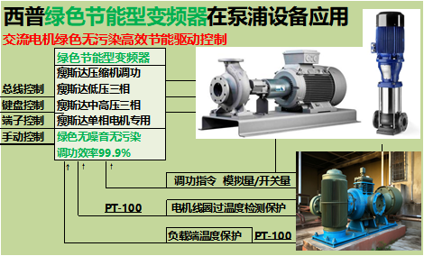 西普绿色节能型变频器做为泵浦设备驱动控制装置可节省50%电气成本,不需要传统挡板、阀门、电磁阀等调功设备;客户不用再投资节能改造及污染防治技术改造,现代化高新科技绿色节能技术可提升泵浦设备绿色节能形象。
