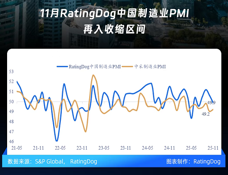 11月RatingDog中国制造业PMI降至49.9,供需走弱重回收缩区间